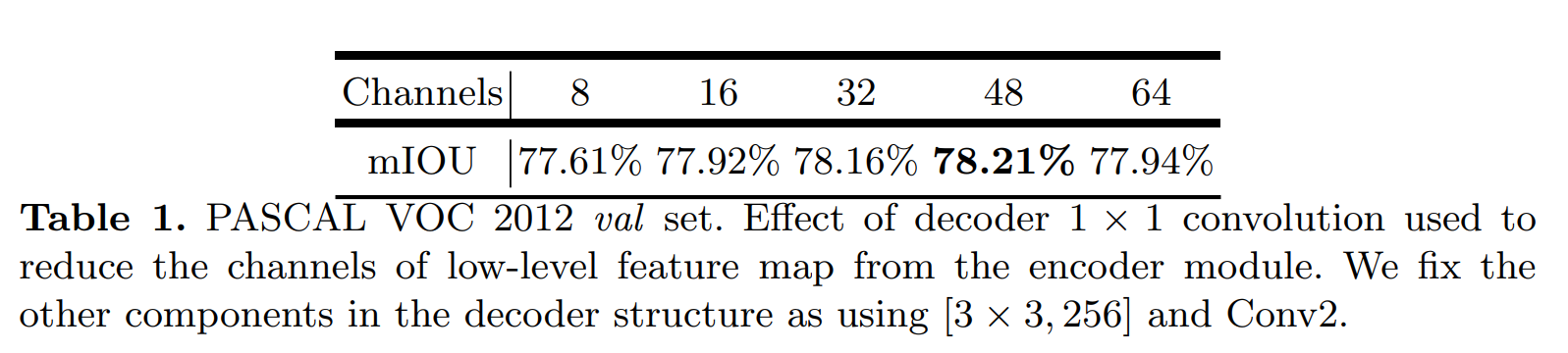 (1) encoder에서부터 온 low-level feature map의 channel을 몇으로 줄일 때 성능이 가장 좋은지